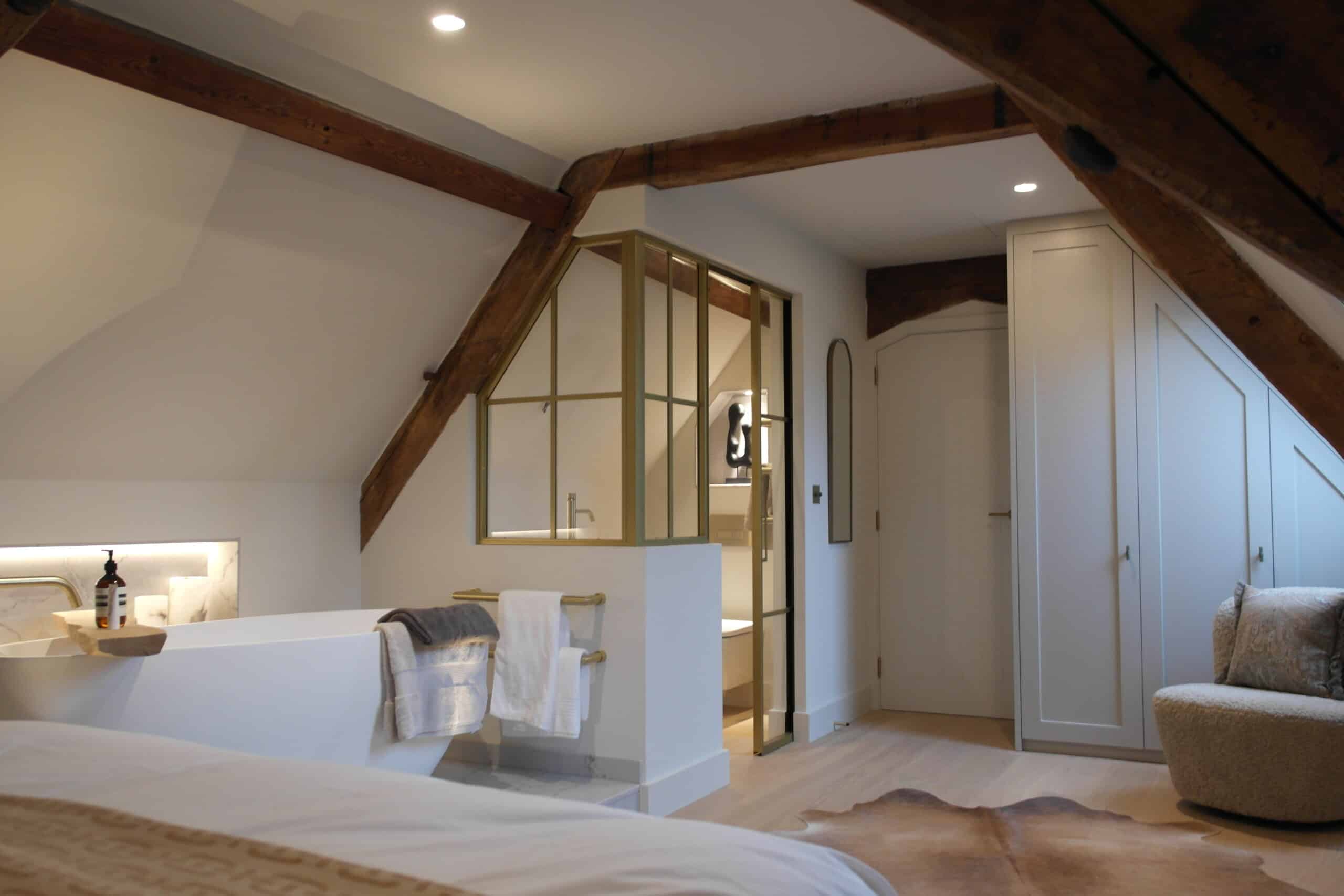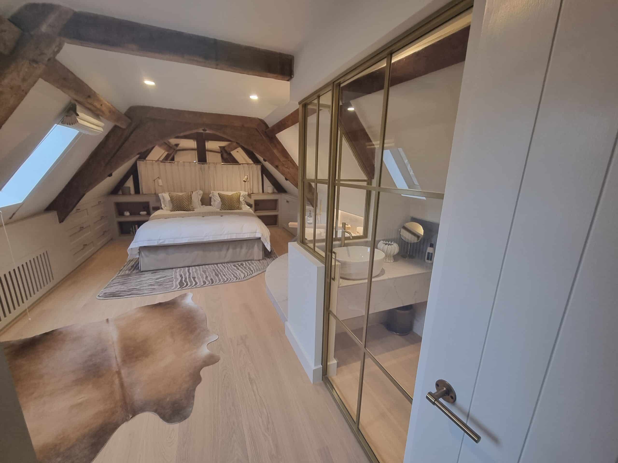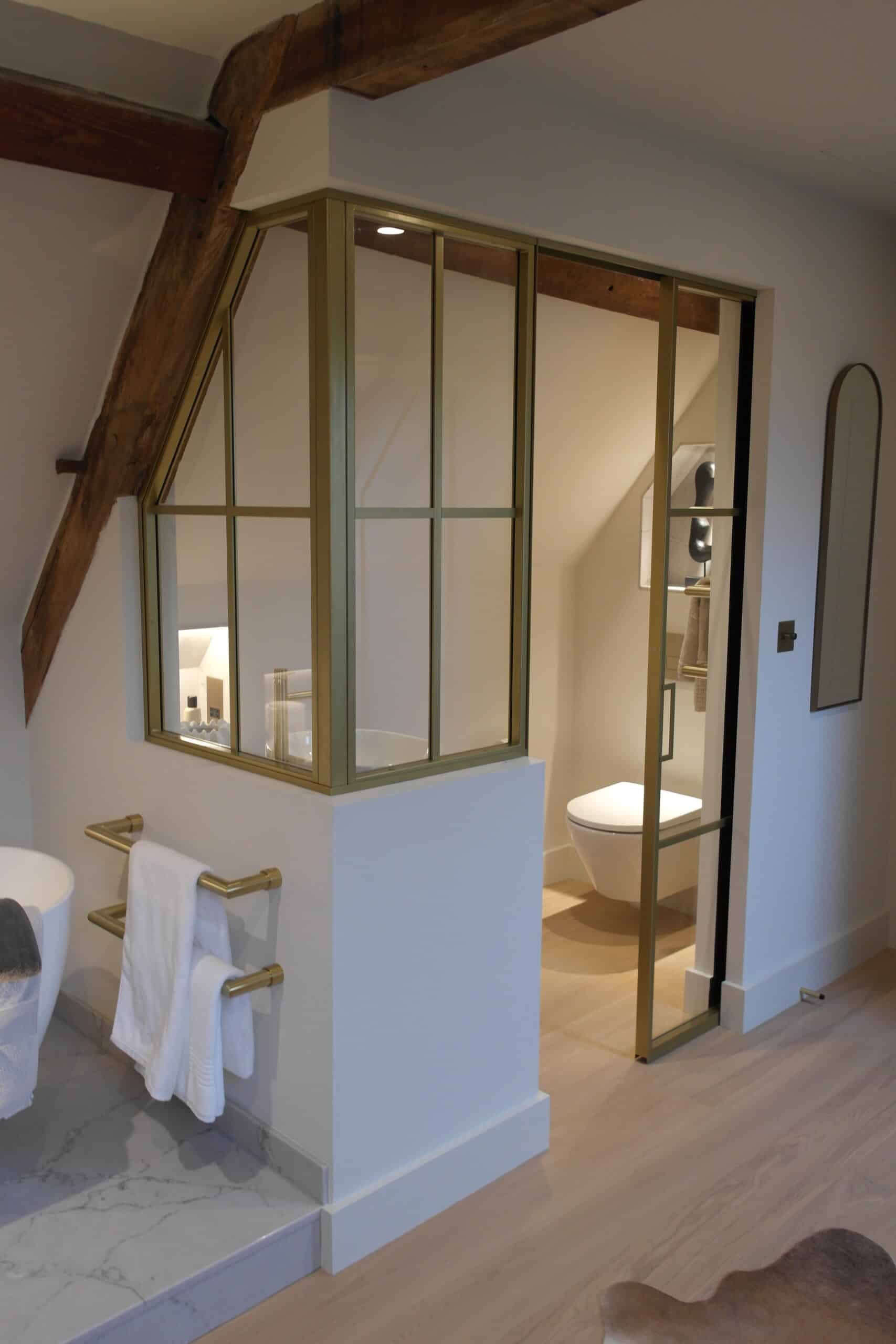 - A steel bathroom enclosure within a guest bedroom, incorporating a sliding pocket door. This allowed the en-suite to be discreetly concealed when not in use, while still feeling connected and light when open.
