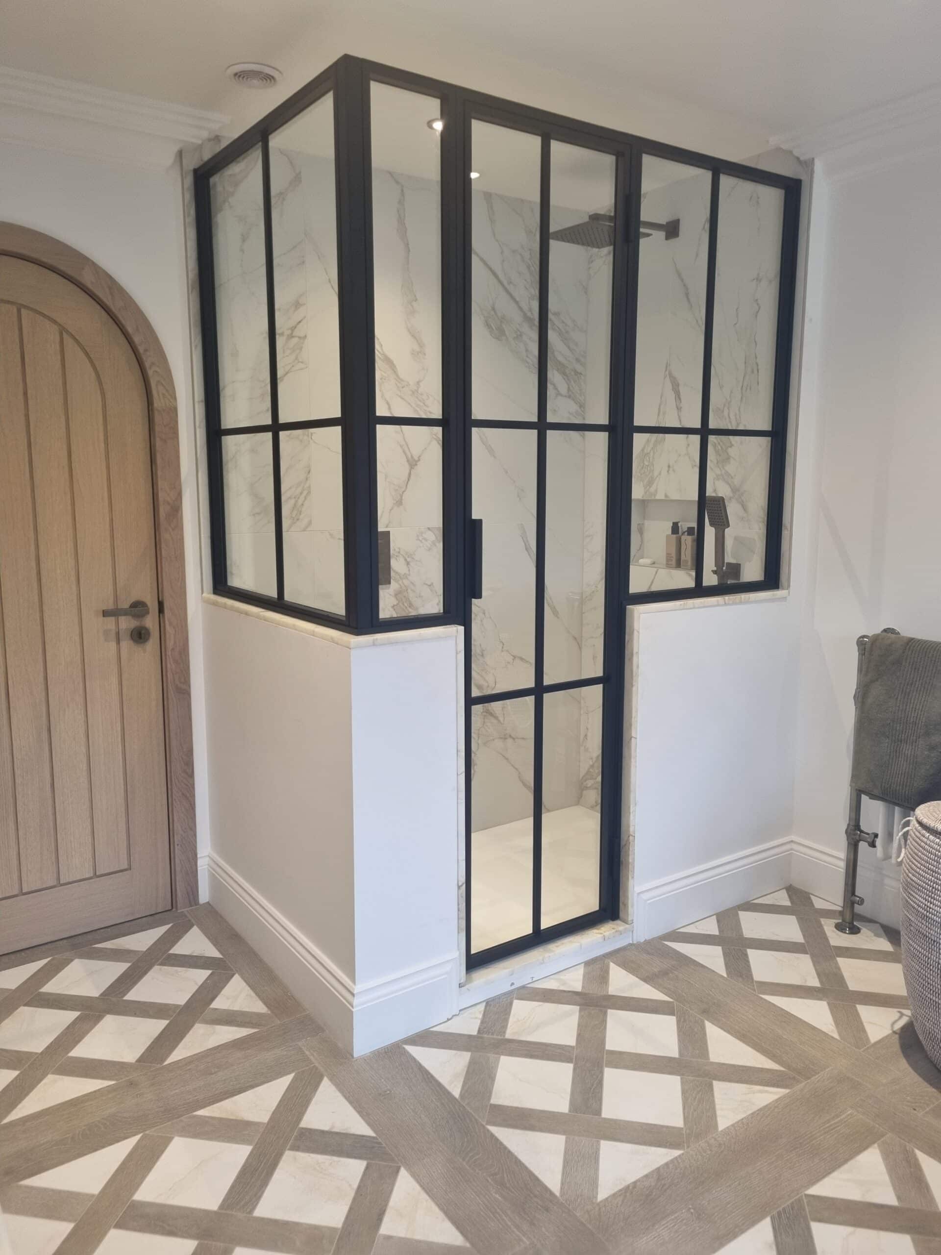 As shown in the completed installation images, the enclosure features slim steel profiles with carefully proportioned glazing bars, creating a crisp, structured appearance that sits comfortably alongside the natural materials used throughout the space. The steel frame provides definition without overpowering the room, allowing light to flow through while subtly zoning the shower area.